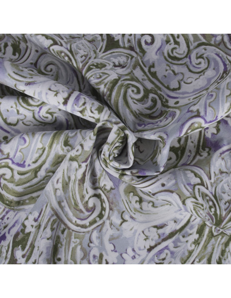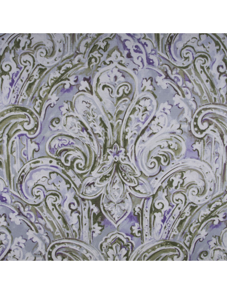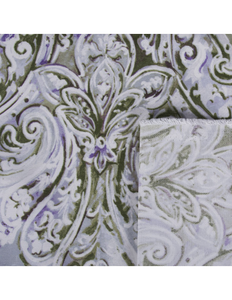 Tela de loneta , dibujo horizontal en tonos verdes y morados sobre fondo blanco. Para uso de textil hogar , confección de cortinas por su caída, cojines , manteles , estores, etc...